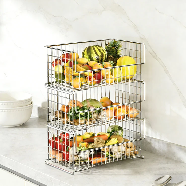 1. Структурні особливості: він має модульну конструкцію, яка дозволяє вільно укладати. Один кошик можна використовувати окремо, а коли кілька кошиків складено, їх можна точно розмістити за допомогою нижніх затискачів, щоб запобігти ковзанню та перекиданню. Корпус кошика з відкритою решіткою в поєднанні з піднятим краєм кошика запобігає скочуванню фруктів і овочів, а також підтримує циркуляцію повітря та зменшує ймовірність псування та псування їжі.